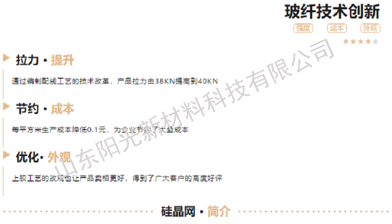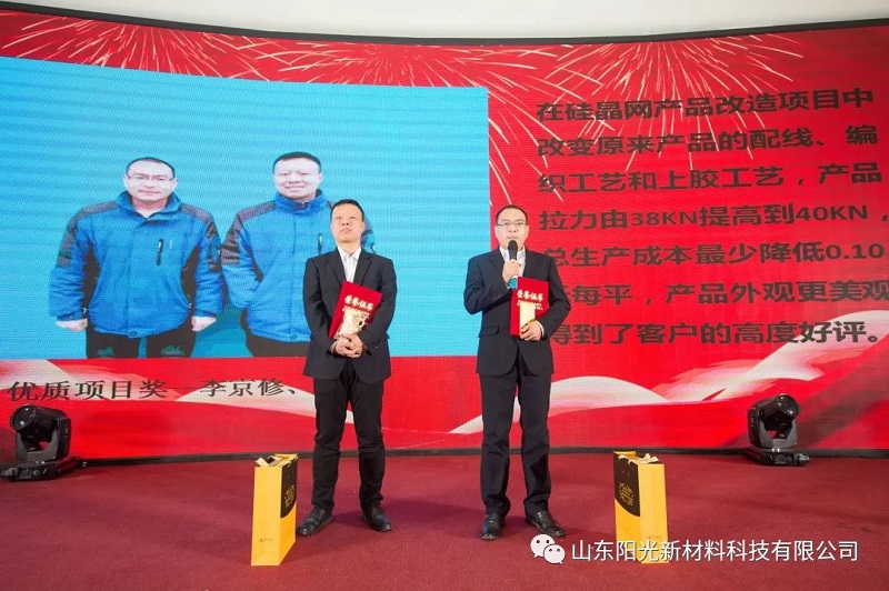 山東陽光新材料科技有限公司技術(shù)人員李京修、徐晉在硅晶網(wǎng)產(chǎn)品改造項目中獲得優(yōu)質(zhì)項目獎,通過改替產(chǎn)品的配線、調(diào)整編制工藝、優(yōu)化上膠方式等途徑,使產(chǎn)品在拉力上由原來的38KN提高到40KN,不僅提高了硅晶網(wǎng)的拉力強度,還降低了生產(chǎn)成本,同時,經(jīng)過調(diào)整的經(jīng)編工藝及上膠流程使得產(chǎn)品更美觀,獲得的廣大客戶的一致好評。
